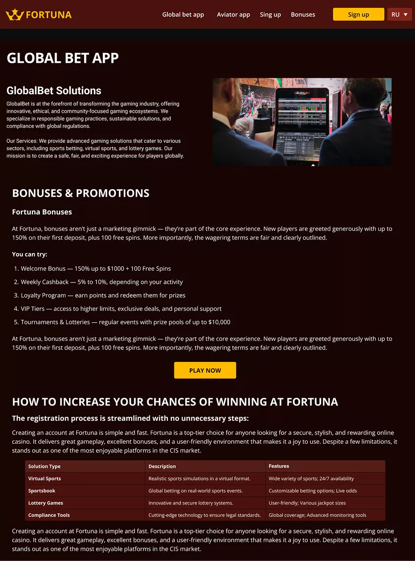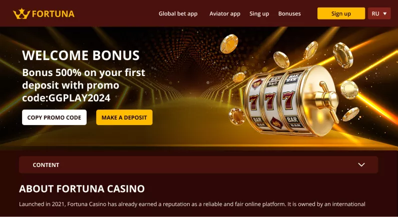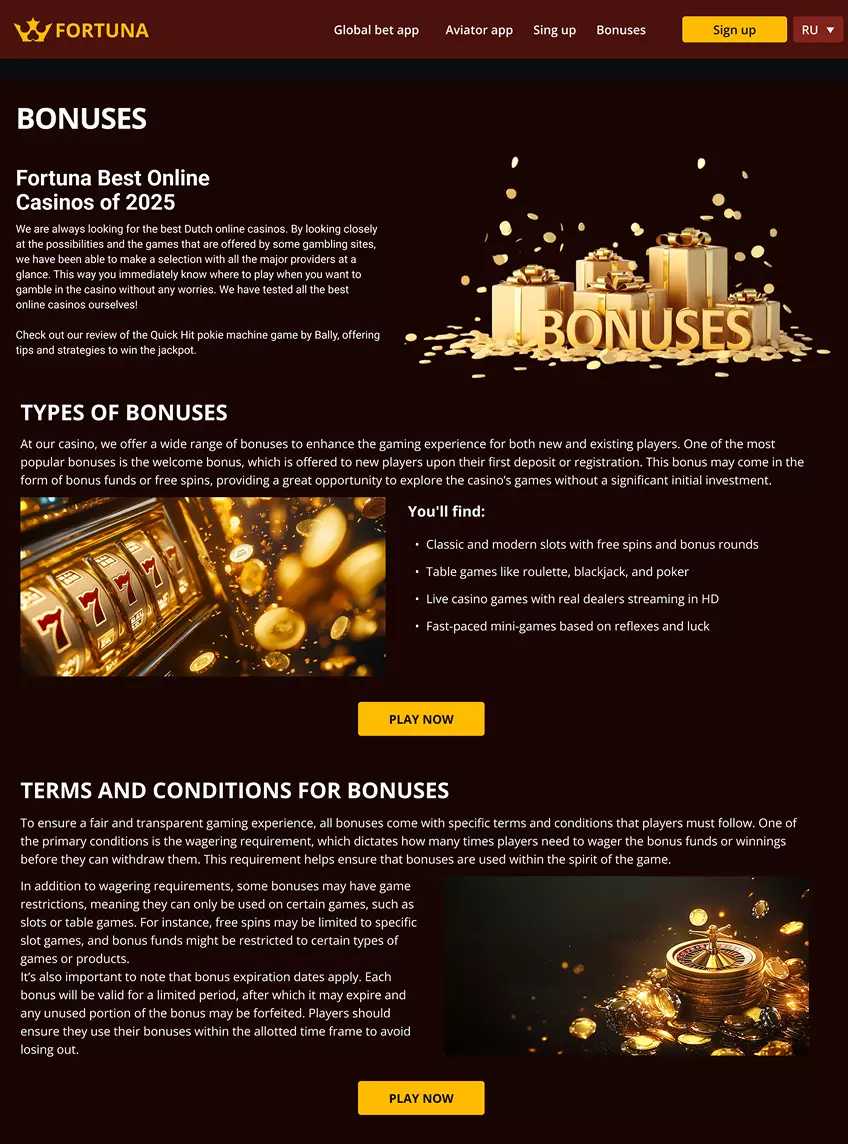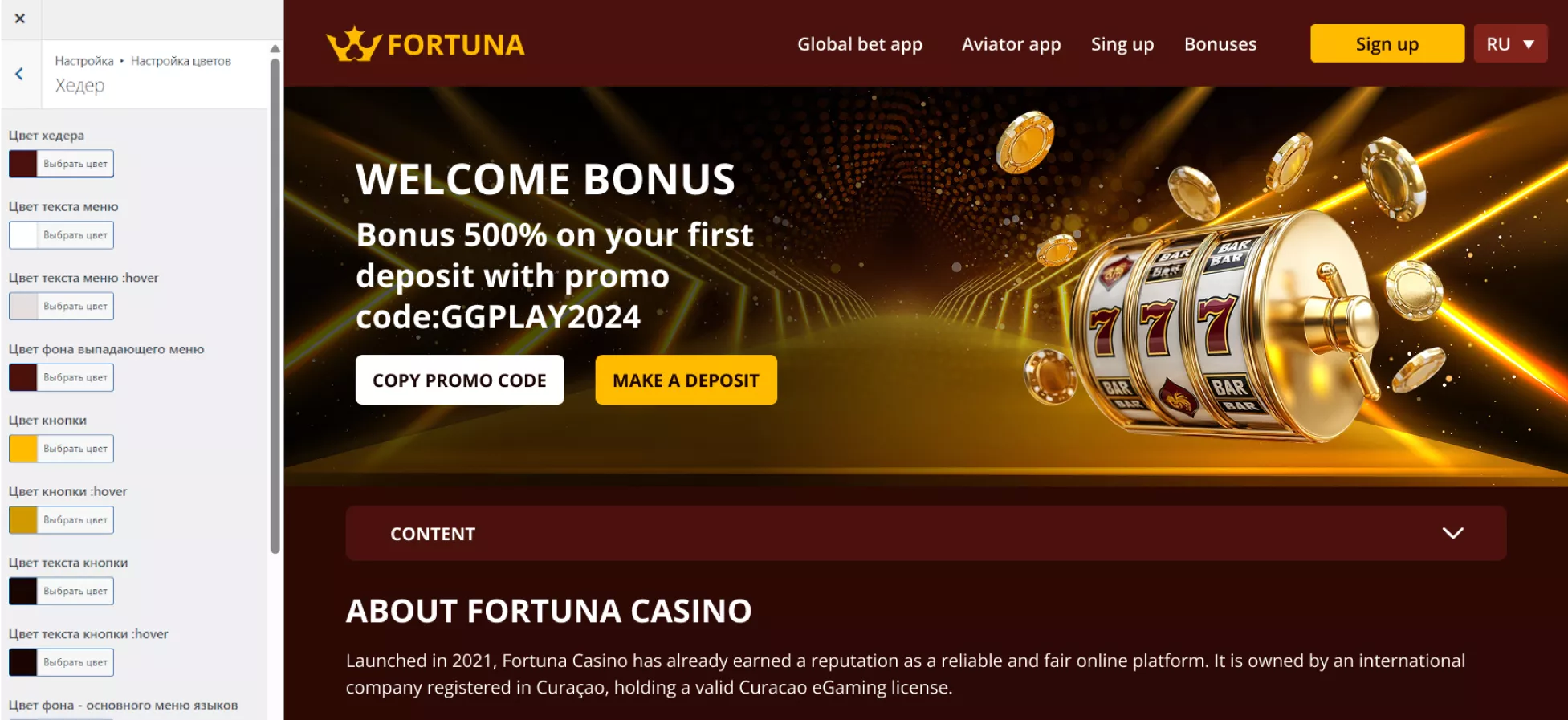 Если вы ищете яркий и запоминающийся сайт, посвящённый одному бренду, с фирменной айдентикой, акцентами на акциях, бонусах и уникальном позиционировании — выбирайте Fortuna