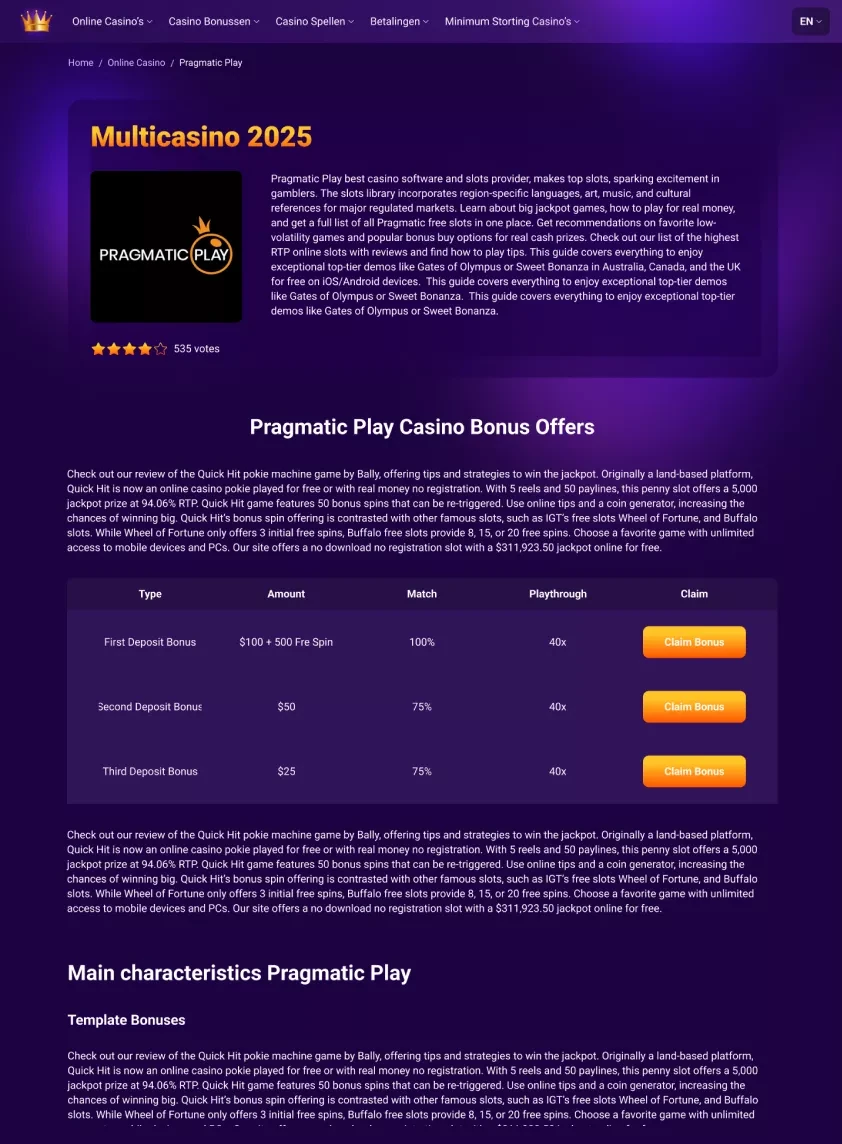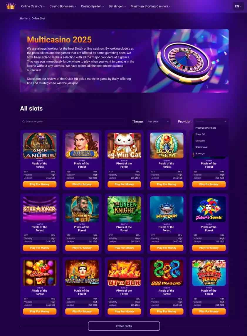 Multicasino — это универсальный шаблон для проектов с множеством разделов и брендов. Он отлично подходит для сравнения казино, обзоров слотов, создания рейтингов, а также тематик, связанных с криптовалютами, финансами, инвестициями и не только. Если вы строите полноценный портал с десятками игровых платформ и провайдеров — этот шаблон для вас